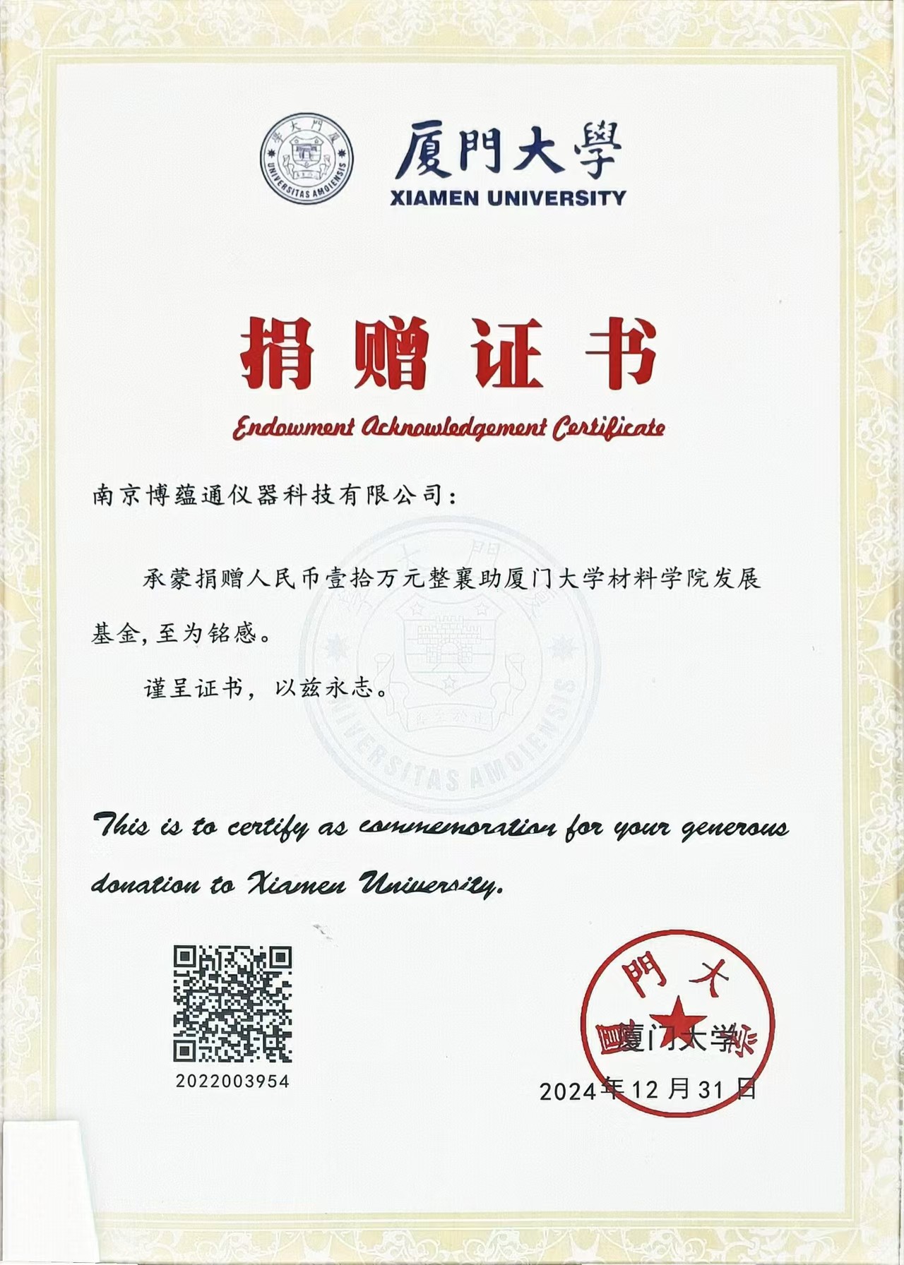 博蕴通仪器科技有限公司助力厦大材料学院发展 捐赠10万元注入新动力