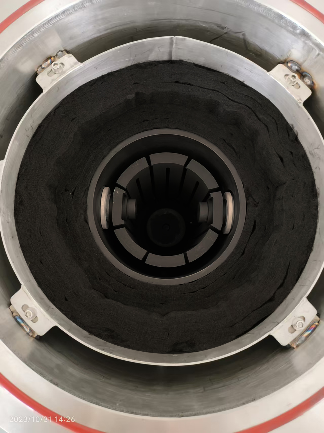 11、发热元件及隔热屏:发热元件采用电极石墨加工成圆筒形的结构,隔热屏采用石墨、碳毡、石墨毡(1层石墨筒,4层碳毪和4层石墨毡,每层厚10mm以上),保温性能好、加热均匀、辐射面大、耐热冲击性好,可快速加热和冷却。保温层和发热分体,易维护和取装,保温套外用不锈钢框架支撑,固定。