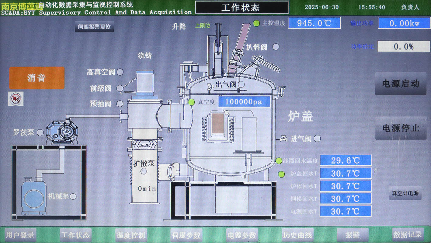 本产品由炉盖、炉体、回转机构、熔炼浇注系统、充气系统、气氛控制系统、真空系统、IGBT 电源、控制系统、水冷系统、工作台、电控系统等组成 ,炉体、气氛控制系统、熔炼浇铸系统、电控系统和水冷系统等组成部分都安装在设备台架上,使整个设备成为一体,炉架下安装有水平调节轮、不但可以自由的拖动,并有调节水平的功能。